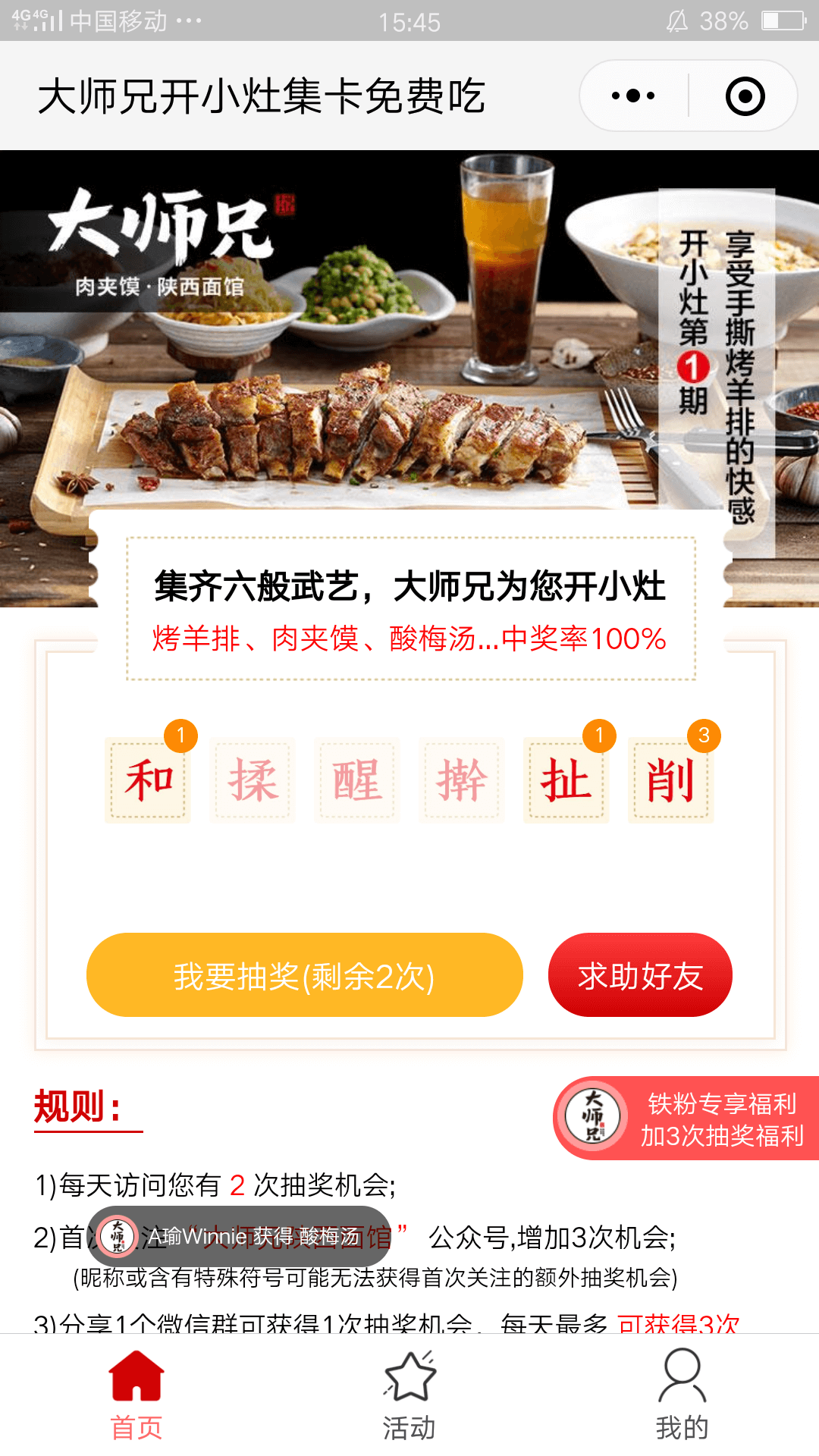 2、大師兄開小灶集卡免費吃小程序的主要功能介紹