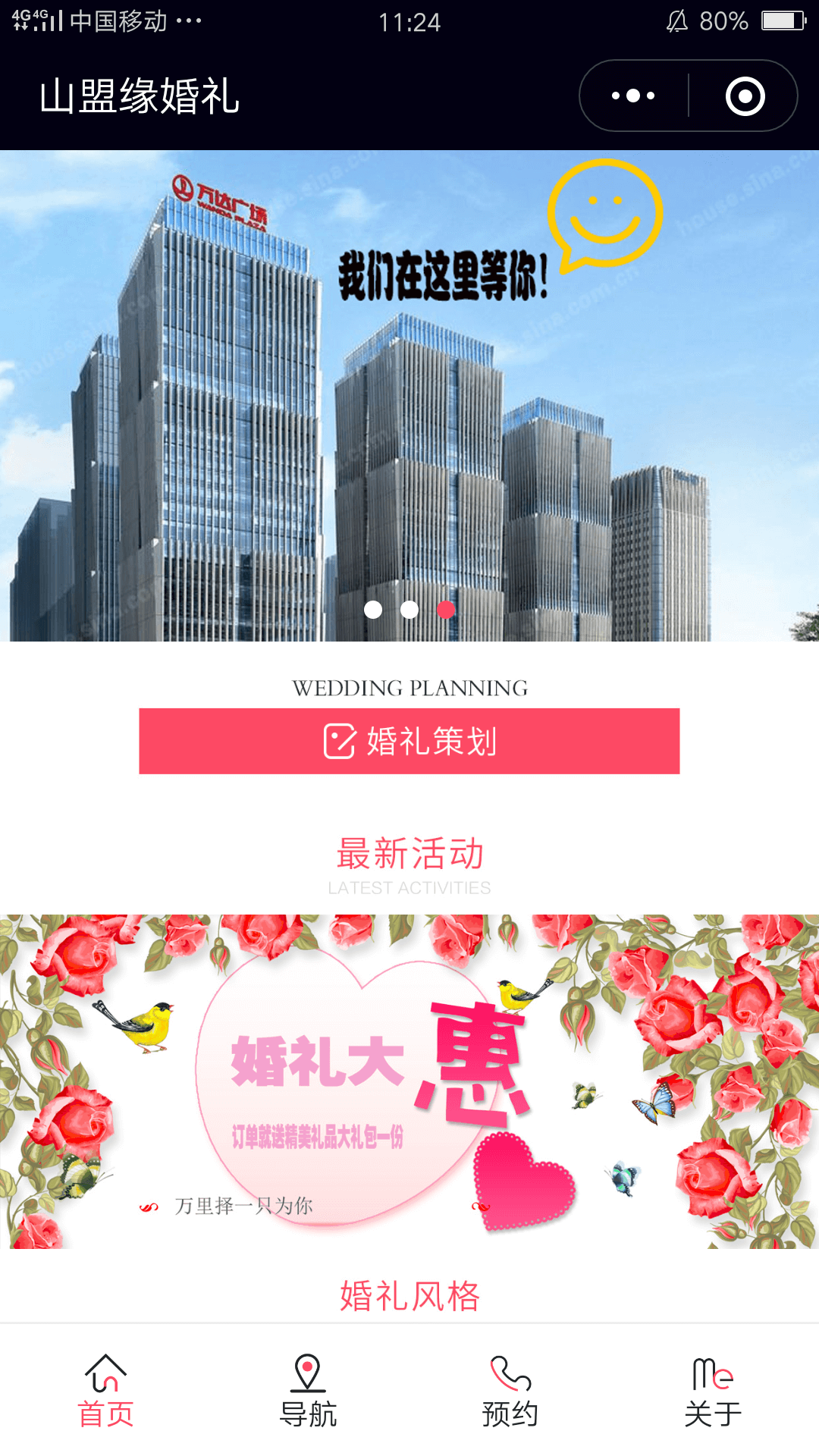 山盟緣婚禮小程序是商家為向用戶展示服務類目、提供服務預約、服務咨詢而開發的一款微信小程序,通過推送資訊內容來展示商家所有服務類目,讓用戶在這個小程序中去了解商家的服務類型,自主選擇婚慶服務風格,并可一鍵撥打客服電話預約婚慶服務。